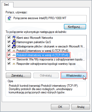 - Następnie zaznacz 'Protokół internetowy w wersji 4 (TCP/IPv4)' i użyj przycisku 'Właściwości'.