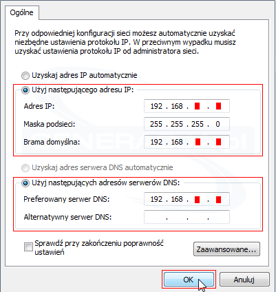 - W oknie 'Właściwości: protokoł internetowy w wersji 4' zaznacz opcję 'Użyj następującego adresu IP' oraz 'Użyj następujących adresów serwerów DNS' i uzupełnij wymagane pola. Następnie kliknij przycisk 'OK'.