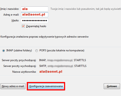 - Po automatycznym wyszukaniu ustawień dla Twojej skrzynki e-mail, kliknij przycisk 'Konfiguracja zaawansowana'.