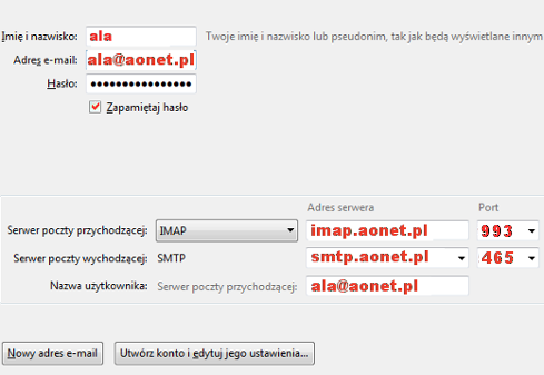 serwer poczty przychodzącej IMAP: imap.aonet.pl port 993 (z SSL)