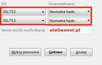 serwer poczty wychodzącej SMTP: smtp.aonet.pl port 465 (z SSL)