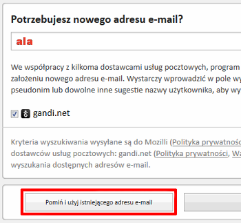 - Rozpocznij konfigurację nowego konta e-mail. Jeśli na ekranie zostanie wyświetlone okno 'Potrzebujesz nowego adresu e-mail?', kliknij przycisk 'Pomiń i użyj istniejącego adresu e-mail'.