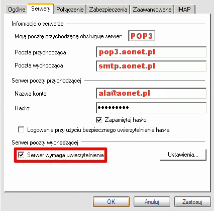 Jeżeli zdecydujesz się na wariant 1 czyli POP3 i SMTP z TLS to Twoje ustawienia powinny wyglądać tak jak na rysunku poniżej.