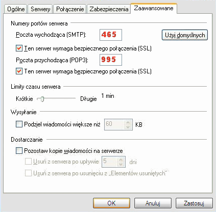 Jeżeli zdecydujesz się na wariant 2 czyli POP3 i SMTP z SSL to Twoje ustawienia powinny wyglądać tak jak na rysunku poniżej. Pamietaj, żeby zaznaczyć dwie opcje jako aktywne: 'Ten serwer wymaga bezpiecznego połączenia (SSL)'.