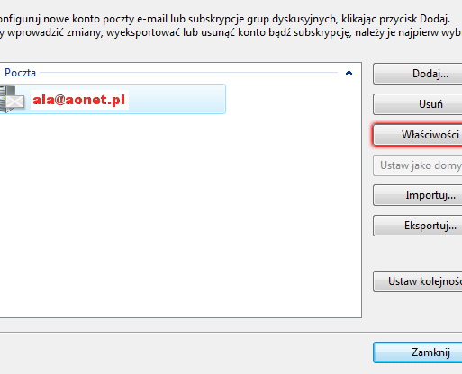 - Zaznacz skrzynkę e-mail, dla której nazwa serwera poczty przychodzącej POP3 oraz numery portów mają zostać zmienione i kliknij przycisk 'Właściwości'.
